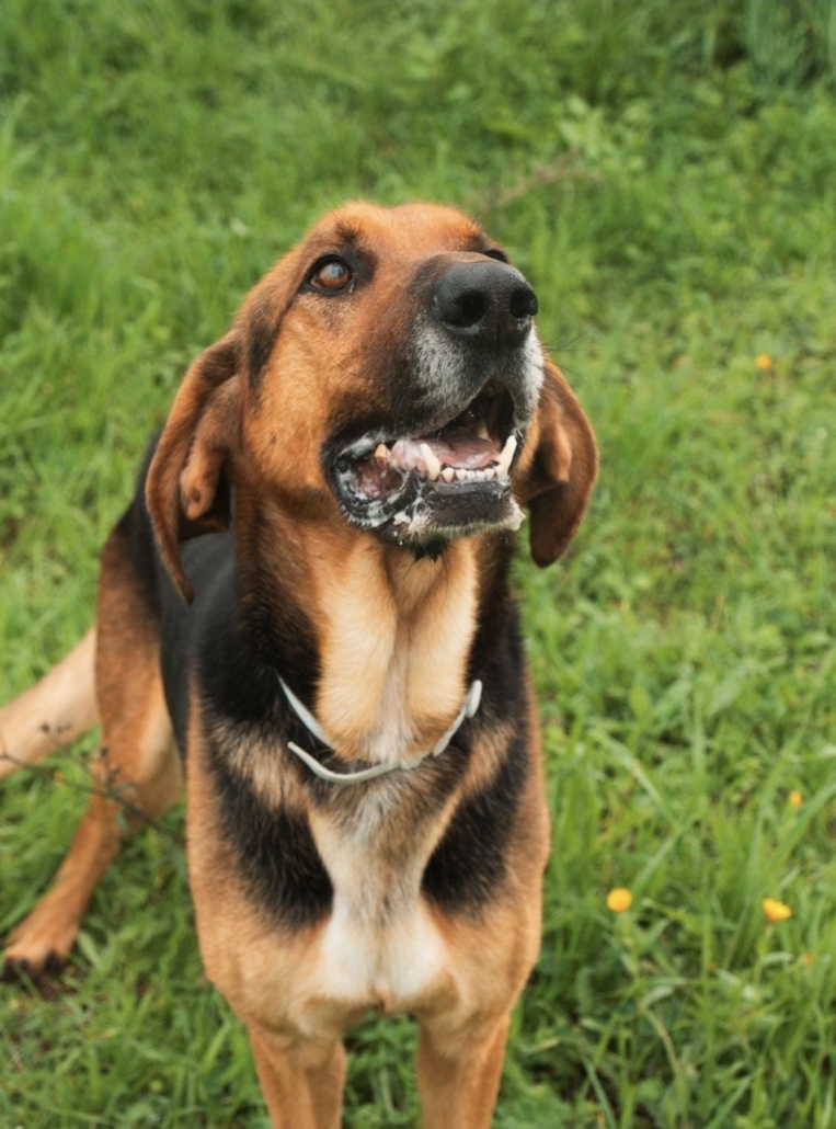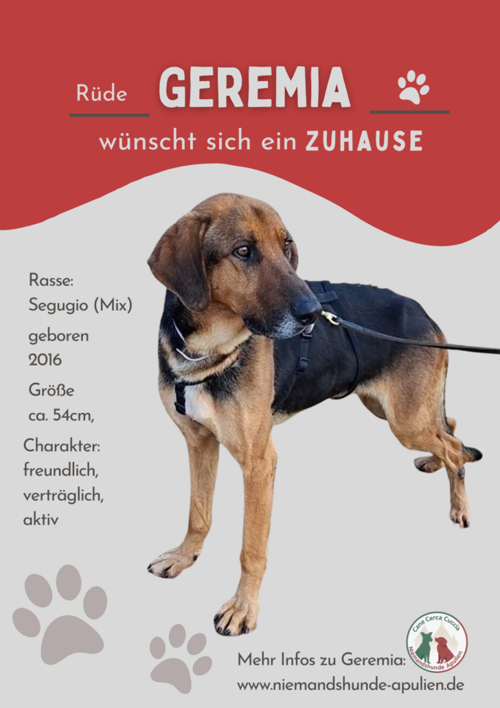 Geremia ist ca.10 Jahre alt, freundlich und anhänglich, verträglich mit Rüden und Hündinnen, die nicht zu dominant sind.